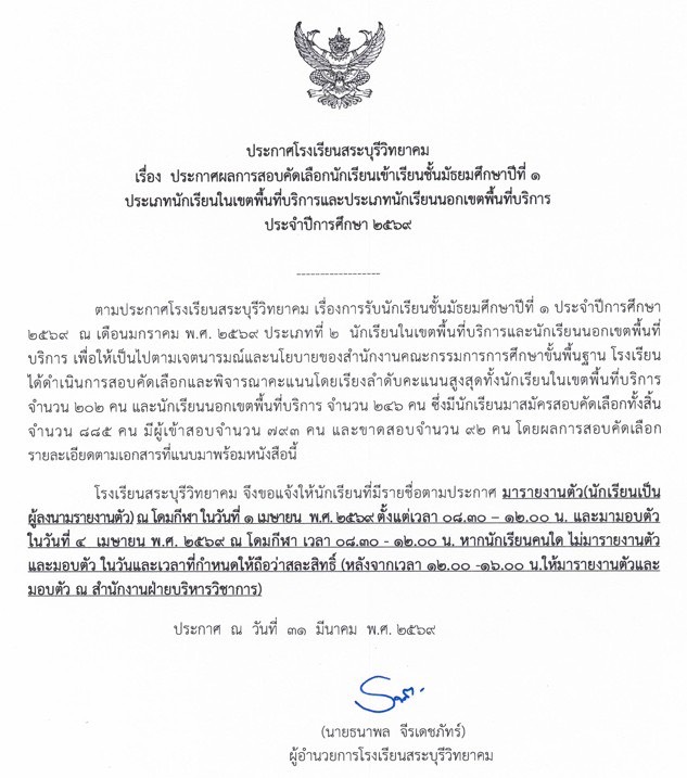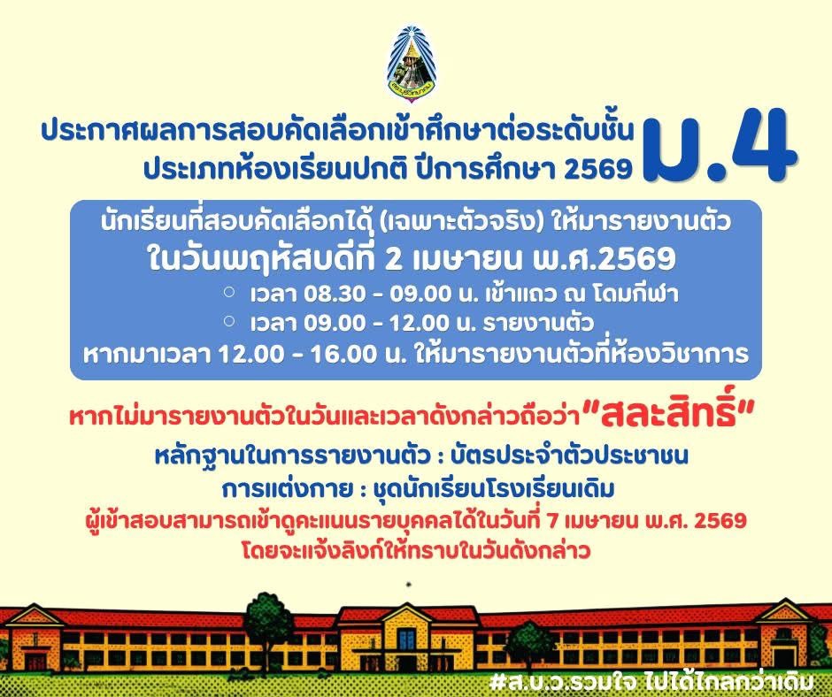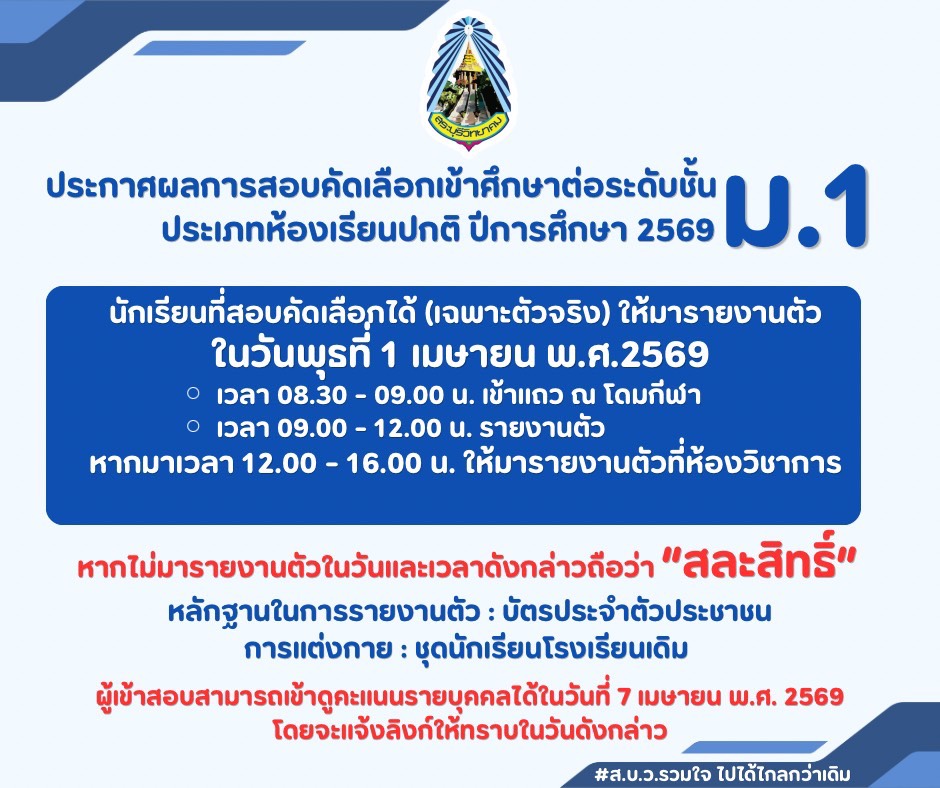 ประกาศผลสอบคัดเลือก ม.1 ประเภทห้องเรียนปกติ ปีการศึกษา 2569